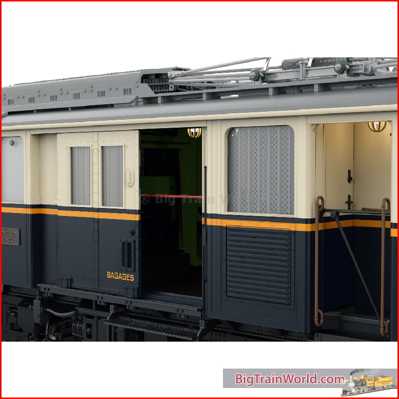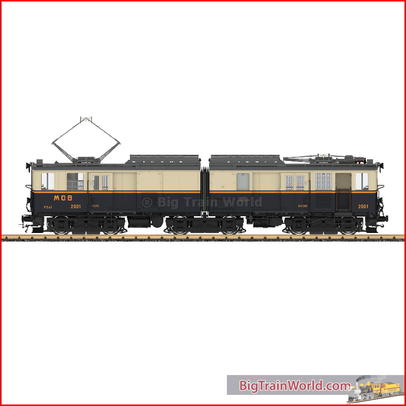 De bagage-motorwagen type FZe 6/6 van de MOB als metalen model.In de jaren '30 zocht de MOB naar geschikte locomotieven voor het trekken van de 'Golden Mountain Pullman Express' die de CIWL wilde gaan inzetten op de steile trajecten van de MOB. Men besloot voor dit doel twee elektrische motorwagens met bagagecompartiment te verwerven. Deze motorwagens werden gebouwd door SIG/BBC en hadden een vermogen van ruim 110 pk. De beide voertuigen werden in 1932 en 1933 als type FZe 6/6 in het bestand van de MOB opgenomen met de nummers 2001 en 2002. Deze motorwagens met de as indeling Bo'Bo'Bo' hadden een lengte over de buffers van 17 meter en konden een maximum snelheid van 60 km/u bereiken. Ze behoorden in die tijd wereldwijd tot de sterkste elektrische locomotieven op meterspoor! De beide elektrische motorwagens waren bestemd om luxe treinen te gaan trekken maar daarvoor zijn ze, op een paar ritten na, nooit gebruikt omdat de crisis van de jaren dertig deze markt liet instorten. Daarom zette de MOB de beide motorwagens voor het goederenverkeer in. In de loop van de jaren werden de voertuigen meermaals veranderd en omgebouwd. Vooral aan het einde van de jaren'60 waren de trekkende voertuigen erg nuttig voor de aanvoer van cement van Montreux naar Allières voor de bouw van de Hongrin stuwdam. Aan het einde van de jaren '80 werd motorwagen 2001 volledig uit elkaar gehaald om deze in de oorspronkelijke toestand terug te brengen. Delen van dit trekkend motorvoertuig werden in Montbovon opnieuw vervaardigd. Voor de revisie van loc 2002 werden onderdelen van de 2001 gebruikt. Het model van deze scharnierende motorwagen wordt nu in schaal 1:22,5 als metalen High-end model in productie genomen. Zoals u al gewend bent van onze andere High End modellen is dit model een zeer hoge graad van detaillering uitgevoerd. De kleuren en opschriften zijn van Periode II. Locomotiefnummer 2001 van de MOB. Met de bij deze periode passende pantografen en dakopbouw. Kleuren en opschriften van de FEz 6/6 2001 in de uitvoering zoals het voertuig in 1933 afgeleverd werd door SIG / BBC en in dienst gesteld werd bij de MOB Met de bijbehorende pantografen en dakopbouw. Het model is voorzien van een mfx/DCC decoder met veel licht- en geluidsfuncties. Zwitserse lichtwisseling, verlichting in de stuurstanden en interieurverlichting, digitaal op- en neer te bewegen pantografen en nog veel meer geven dit 76 cm. lange model grote speelwaarde. Radius R1 kan probleemloos bereden worden.